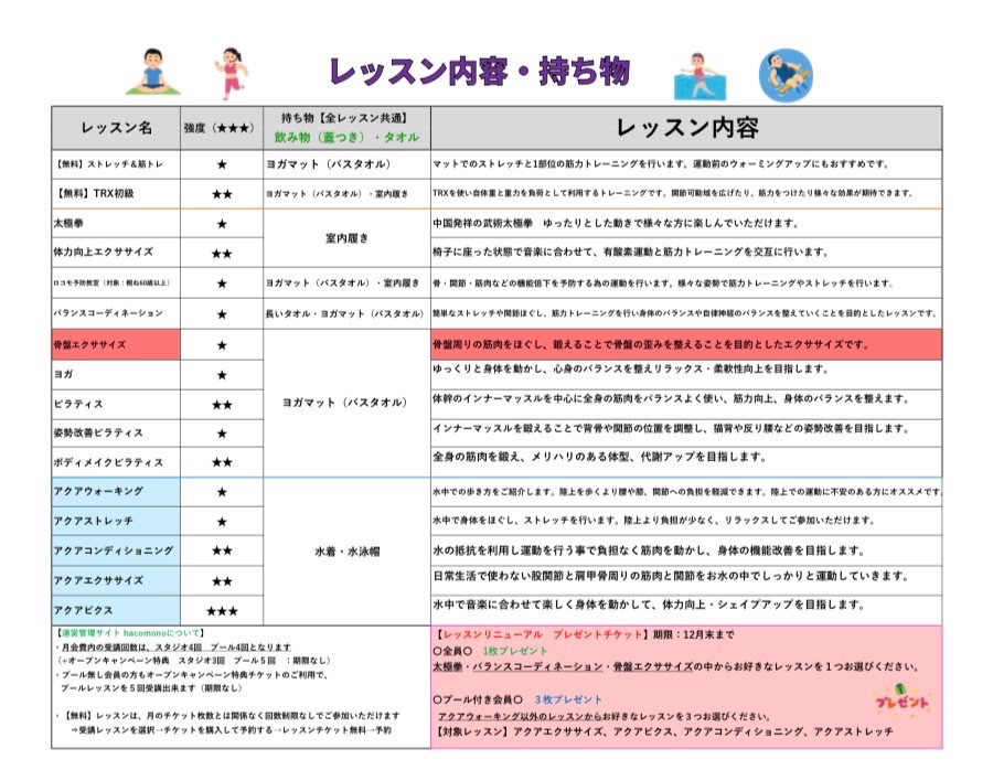 レッスンリニューアルに伴い、対象のレッスンが受けられる