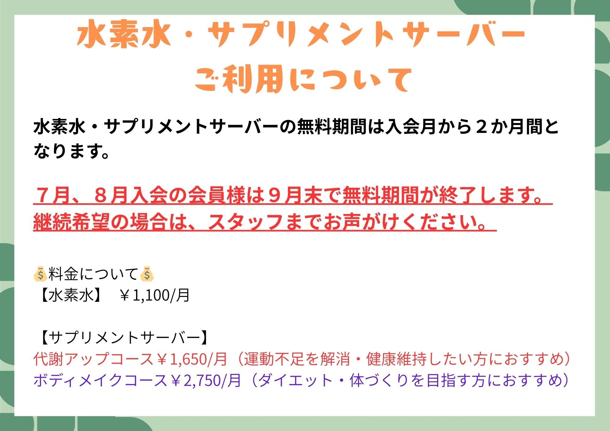 水素水・サプリメントサーバーの無料期間は入会月から2か月間となります。